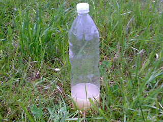 The bottle is between one quarter and one third water. It has two rings of cardboard around it, that in case of excess pressure better split it (although as cardboard are of little use). At the bottom, on one side has a swollen shell or valve. Comes from the inner tube of a bicycle. On the other side is a D-cell battery to counterbalance and straight up. In this shell will connect a bottle (with adapter) of CO2 that is used to inflate bicycle tires punctured. This will give you a very considerable pressure. Finally, the nozzle is a cork with a hole. In this cork is another shell which is placed a pump to inflate. Both shells are secured by various adhesives though because we have been forced to drill the bottle to put the shells were a few holes. Yet the pressure should be sufficient to work.